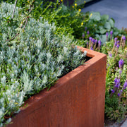 De rechte hoeken en strak vormgegeven randen geven de plantenbak een moderne en krachtige uitstraling. Het natuurlijke cortenstaal ontwikkelt in de loop van de tijd een warme oranjebruine roestkleur, die prachtig contrasteert met groene beplanting.