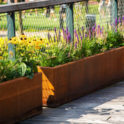De rechte hoeken en strak vormgegeven randen geven de plantenbak een moderne en krachtige uitstraling. Het natuurlijke cortenstaal ontwikkelt in de loop van de tijd een warme oranjebruine roestkleur, die prachtig contrasteert met groene beplanting.